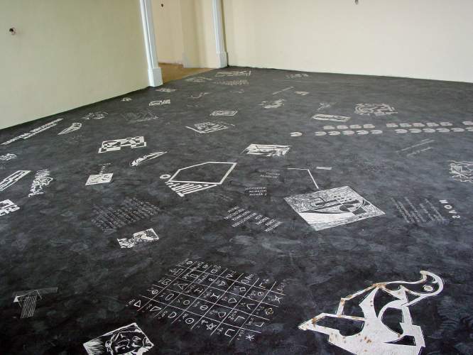 Latifa Echakhch, Sans titre (Les Etrangers), engravings on linoleum, view from the exhibition “Strategies of Learning” curated by Florence Derieux for Periferic 7: Focussing Iaşi, International Biennial for Contemporary Art, Iaşi, Romania, May 12-30, 2006 Credits: Latifa Echakhch and Vector Association |